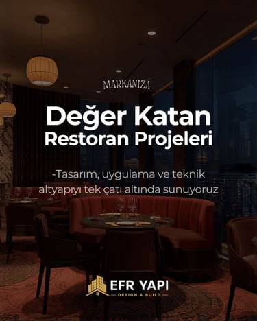 EFR YAPI olarak restoran projelerinde tasarım, uygulama ve teknik altyapıyı kapsayan anahtar teslim çözümler sunuyoruz.